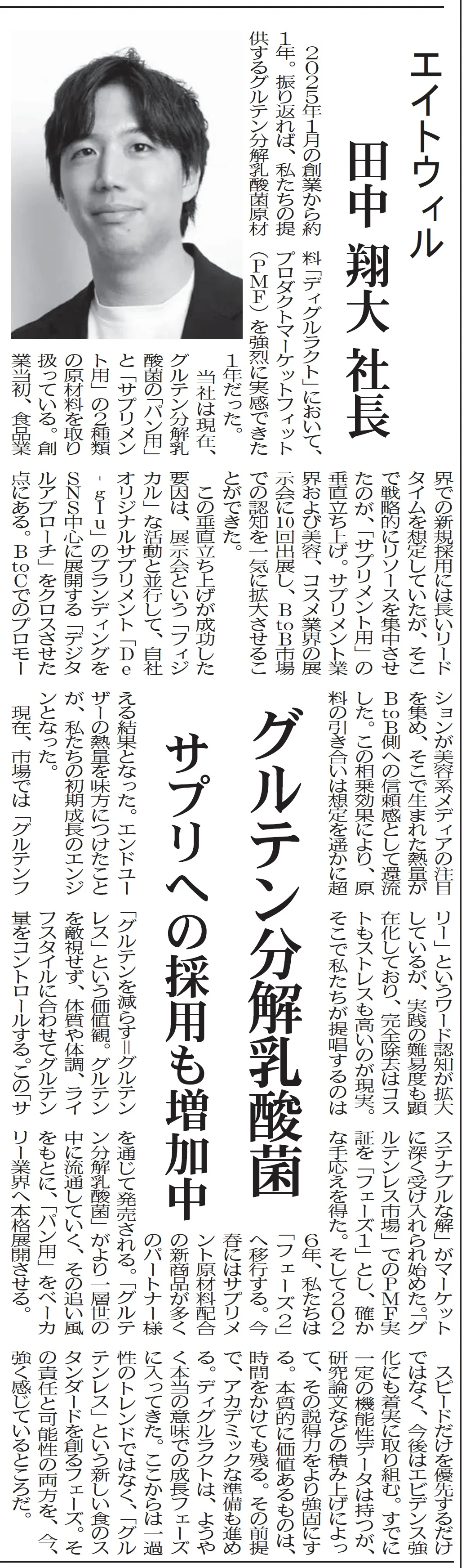 本記事では、2025年1月の創業から約1年の取り組みを振り返りながら、当社が提供するグルテン分解乳酸菌原料「PMF」の市場での手応え(プロダクトマーケットフィット)や、サプリメント分野での採用拡大、今後の事業展望について紹介されています。